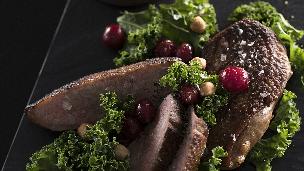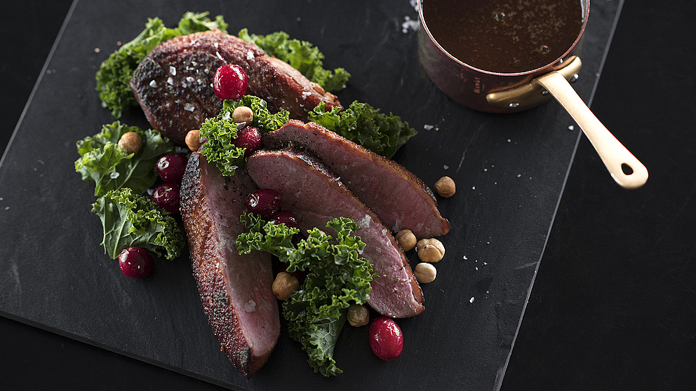 Enebær røget andebryst med stegt grønkål, cremet julesauce og tyttebær