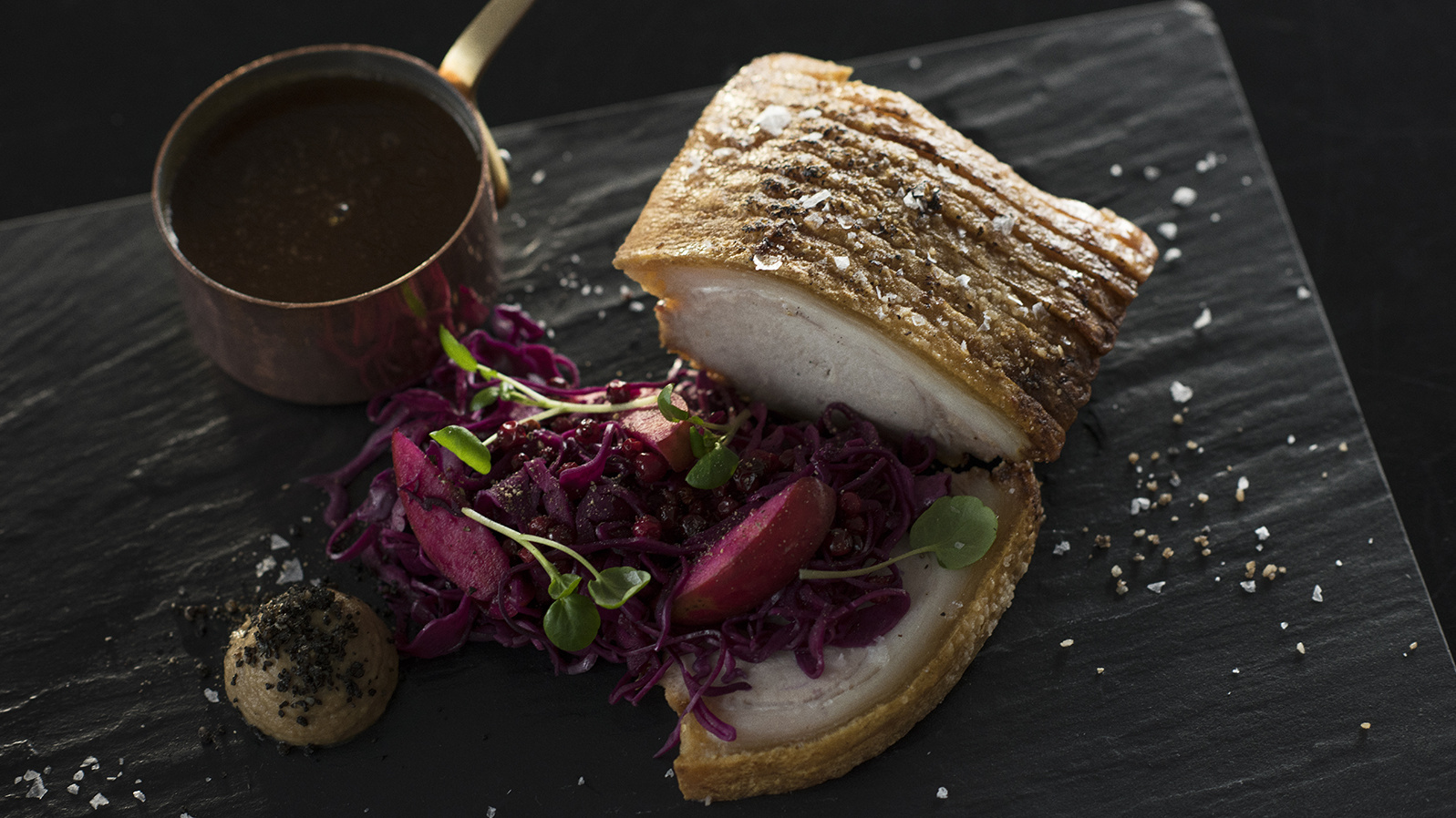 Confiteret gris med syltet ribs, urtemayo og rød mizuna.